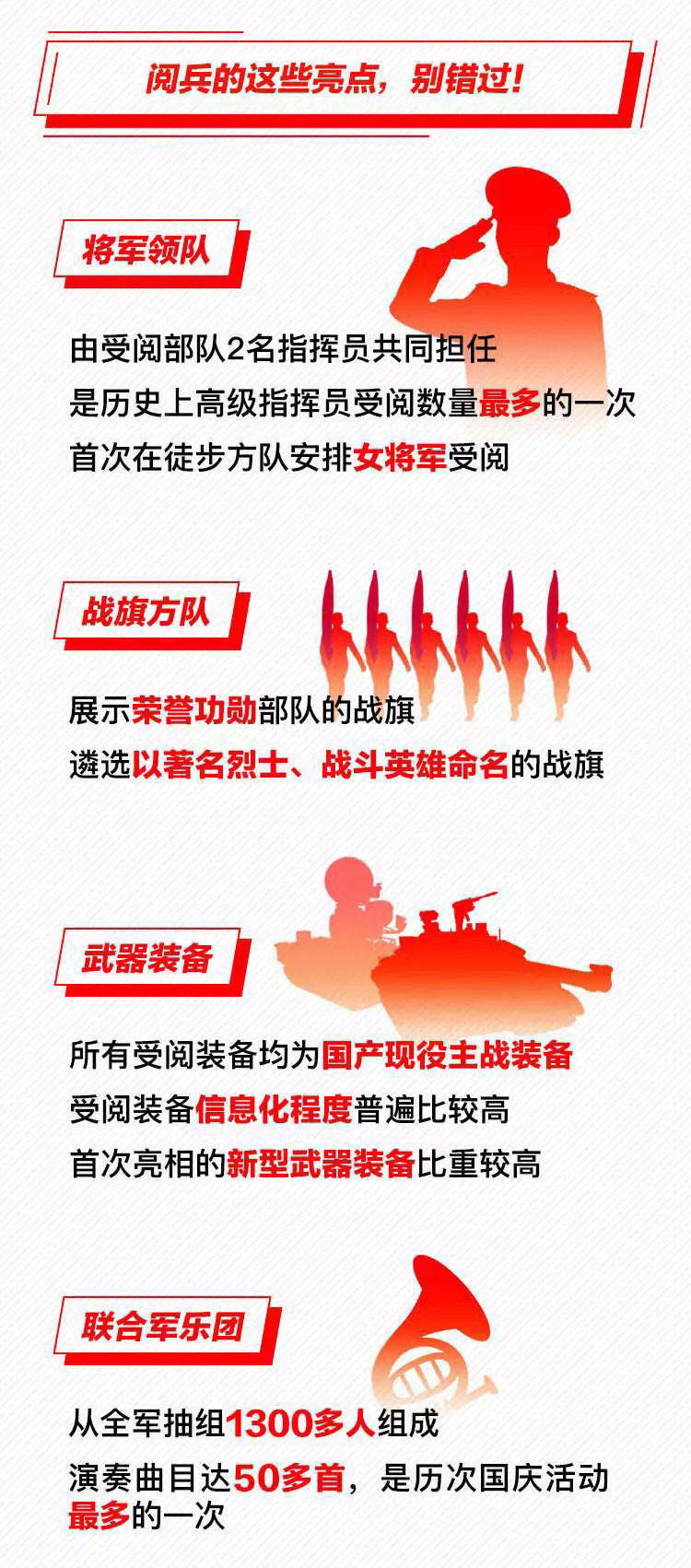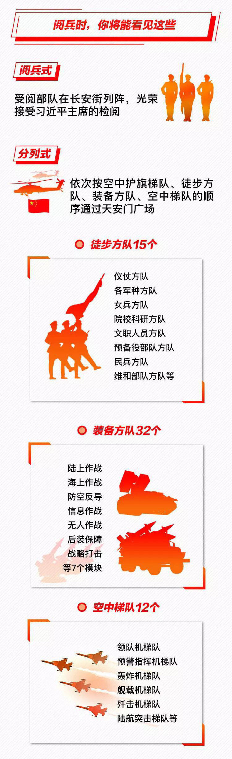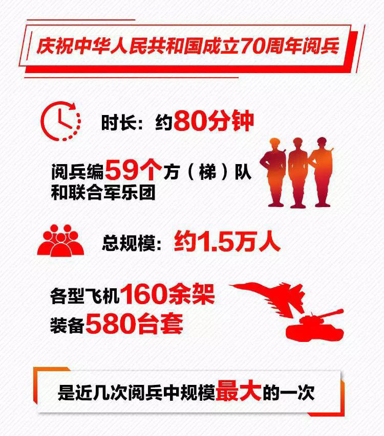 為慶祝新中國成立70周年,10月1日北京天安門廣場將舉行盛大閱兵式。屆時(shí),32個(gè)裝備方隊(duì)、12個(gè)空中梯隊(duì)將通過天安門廣場,接受檢閱。此次閱兵,所有受閱裝備均為國產(chǎn)現(xiàn)役主戰(zhàn)裝備,其中包括我軍部分新型裝備,是近幾次閱兵中規(guī)模最大的一次。