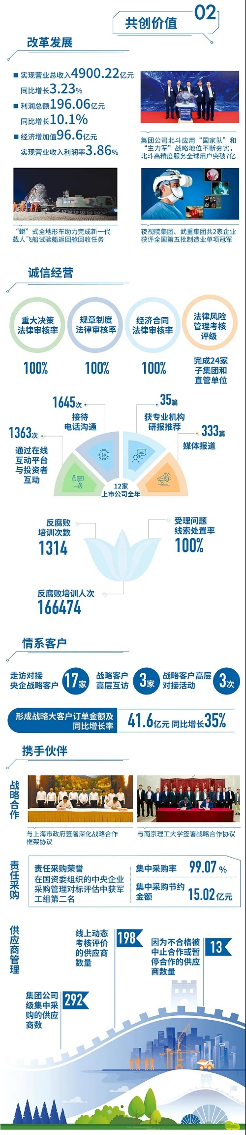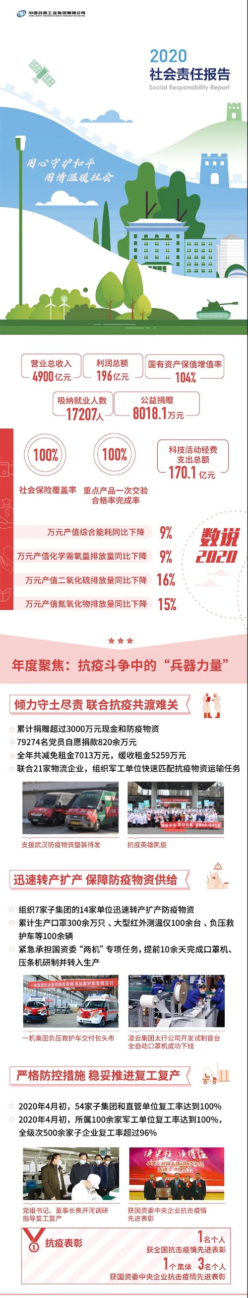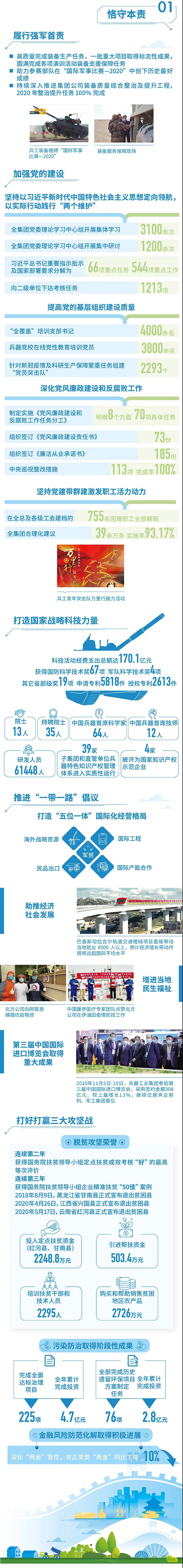 2020年,是“十三五”規(guī)劃收官之年,也是全面建成小康社會、實現第一個百年目標的決勝之年。集團公司黨組書記、董事長焦開河在報告開篇指出,集團公司實現了“十三五”圓滿收官,整體步入了高質量發(fā)展軌道,呈現出基礎更牢、動力更強、空間更大、效能更高的積極向上良好態(tài)勢。在“十三五”特別是近三年來的工作實踐中,我們明確了“集團公司是國家安全和國防建設的脊梁、是國家戰(zhàn)略科技力量最為重要的組成部分、是黨和國家最可信賴的‘六個力量’,肩負著支撐國防軍隊建設、推動科技自立自強、服務構建新發(fā)展格局的重大政治責任和光榮使命,具有極強的政治屬性,性質特殊、使命特殊、責任特殊”的新時代新階段職責使命,深化了對“堅持以習近平新時代中國特色社會主義思想定向領航,是集團公司高質量發(fā)展的根本遵循;保持貫徹落實習近平總書記重要指示批示和黨中央決策部署的戰(zhàn)略定力,是集團公司高質量發(fā)展的根本前提;履行好強軍這個首要職責,是集團公司高質量發(fā)展的根本要求;加快兵器科技創(chuàng)新突破,是集團公司高質量發(fā)展的根本支撐;加強黨的領導黨的建設,是集團公司高質量發(fā)展的根本保證”的兵器工業(yè)改革發(fā)展規(guī)律認識。 《報告》聚焦“抗疫斗爭中的‘兵器力量’”,生動展示了集團公司抗擊疫情的有力行動,展現了集中力量辦大事、急國家之所急的“兵器速度”,彰顯了“把一切獻給黨”的人民兵工精神和貫徹落實國家決策部署的責任擔當。《報告》以“用心守候和平、用情溫暖社會”為主題,從恪守本責、共創(chuàng)價值、致力和諧、踐行綠色、責任管理五個維度,全面展現集團公司在堅持履行政治責任、經濟責任、社會責任,履行強軍首責、加強黨的建設、打造國家戰(zhàn)略科技力量、推進“一帶一路”倡議、打好打贏三大攻堅戰(zhàn)、深化改革、助力員工成長、支持社會公益事業(yè)、提升社會責任管理等方面的生動實踐和履責亮點,凸顯集團公司保持貫徹落實黨中央決策部署的戰(zhàn)略定力、在聚焦主責主業(yè)、科技引領、國際化經營上持續(xù)用力,為實現第一個百年奮斗目標貢獻力量的初心與行動?!秷蟾妗吩俅潍@得中國企業(yè)社會責任報告評級專家委員會“五星佳”最高評級,兵器工業(yè)集團成為軍工行業(yè)唯一連續(xù)10年獲得最高評級的企業(yè)。 2021年是開啟新征程的開局之年,也是建黨100周年、人民兵工創(chuàng)建90周年,兵器工業(yè)集團將全面貫徹落實黨中央戰(zhàn)略部署,緊扣推動高質量發(fā)展主題,圍繞“十四五”開好局、起好步,堅決完成黨中央賦予的職責使命,履行好中央企業(yè)和軍工集團的政治責任、經濟責任、社會責任,為實現中國夢強軍夢作出新的更大貢獻! 一圖看懂《中國兵器工業(yè)集團有限公司2020年社會責任報告》